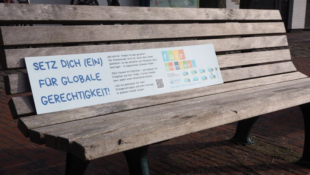 Um im Alltag über uns und unser Anliegen zu „stolpern“, haben wir eine „fair am meer.“ – Informationstafel erstellt, mit denen die Kooperationspartner in ihren Fairtrade-Towns vorhandene Sitzbänke „verschönern“. Die Tafeln laden ein, sich zu setzen, sich mit einem sehr kurzen Text zu informieren und bei weitergehendem Interesse über den QR Code auf die „fair am meer.“ – Website zu gelangen.